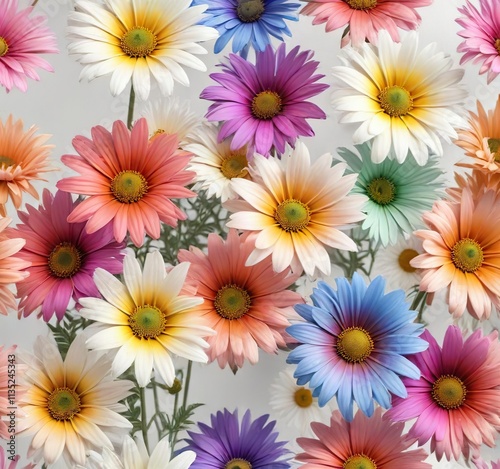Whimsical daisies in gradient rainbow colors on a white background, cheerful, botanical, floral, abstract, colorful
