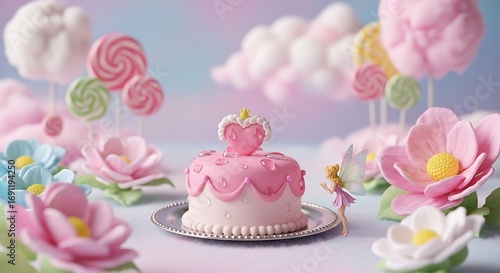 cake, fairy, lollipop, candy, flower, pastel, whimsical, fantasy, sweet, dessert, celebration, birthday, magical, dreamy, cute, miniature, decorative, confection, treat, fairy tale