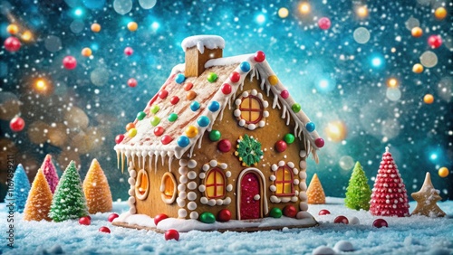 Whimsical gingerbread house in winter wonderland setting with snowflakes gently falling on its roof and walls covered in colorful icing and candy decorations, festive atmosphere, winter scene