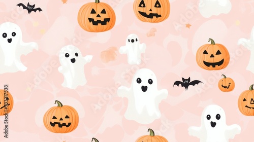 Whimsical Halloween pattern featuring playful ghosts, cheerful pumpkins, and bats on a soft pink background.