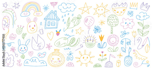 doodle, hand-drawn, vignetting, illustration, cartoon, children, children, drawing, cute, colourful, pastel, rainbow, rabbit, rabbit, house, cloud, rain, leaf, balloon, star, sun, flower, tree, tulip, nubes, crown, cygnet, acorn, nature, element, design, background, hand-drawn, whimsical, flower
