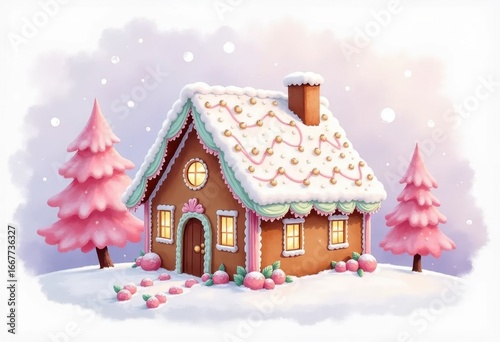 gingerbread house, christmas, illustration, winter, snow, christmas, holiday, new year, celebration, festive, cute, fairy tale, sweet, food, candy, pink, cookie, house, home, decoration, art, drawing, watercolor, whimsical, magical, landscape, tree, snowy, dessert, baking, background, nobody, no people, fantasy, greeting card, cartoon, icing, traditional, bungalow