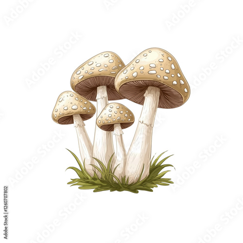 Whimsical Illustration of Four Fantasy Mushrooms in Green Grass