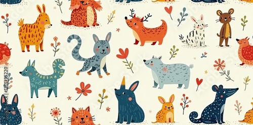 Whimsical miniature creatures in a seamless pattern, wild, graphic, print
