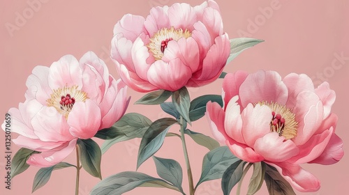 Whimsical Pastel Colored Drawing of Cute Pink Peonies by Children with Clean Lines