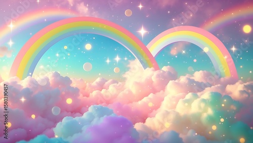 Whimsical pastel sky with double rainbows and fluffy clouds sparkling with stars and bokeh