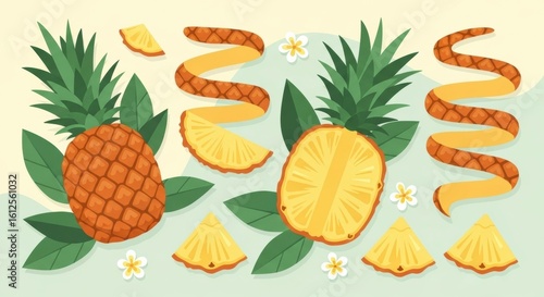 pineapple, tropical, fruit, foliage, slice, peel, vitamin, healthy, summer, leaf, exotic, sweet, juicy, freshness, vibrant, cartoon, drawing, graphic, illustration, artwork, cut-out, arrangement, collection, design, organic, delicious, vegetarian, vegan, diet, botanical, alimentary, ripe, yellow, green, tasty, natural, textured, decorative, element