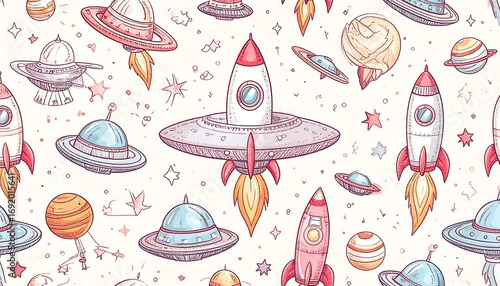 rocket, spaceship, flying saucer, planet, star, space, cosmos, galaxy, universe, astronomy, cartoon, illustration, pattern, seamless, background, whimsical, cute, childish, colourful, design