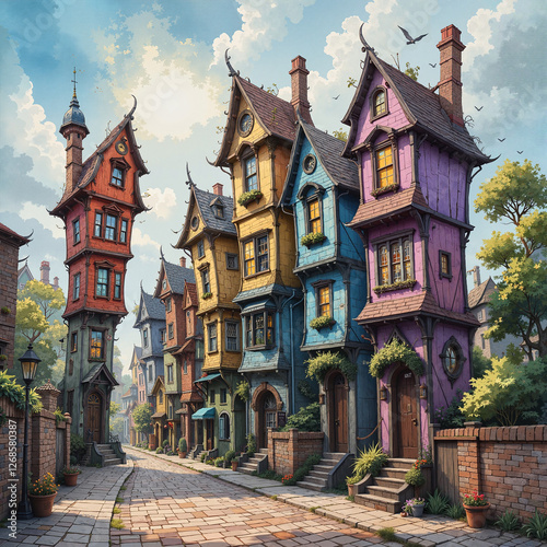 Whimsical street with colorful quirky houses in vibrant colors and blue sky