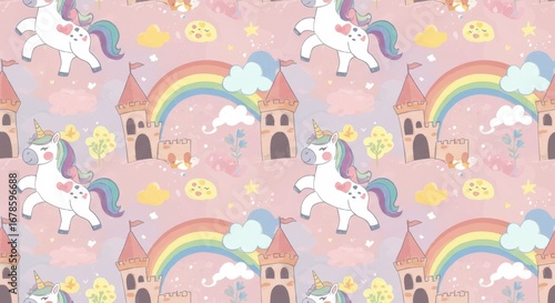 unicorn, rainbow, castle, cloud, star, pattern, seamless, background, pink, cute, colourful, fantasy, magical, fairy tale, illustration, design, wallpaper, textile, fabric, print, repeating, whimsical, childish, children, children, baby, childcare center, pastel, art, drawing, hand-drawn, cartoon, happy, joy, dream, love, nubes, pony, horse, animal, sky, nature, landscape, decoration, ornament, element, graphic