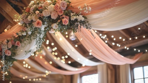 Whimsical wedding reception hall, featuring pastelcolored drapes, fairy lights, and floral garlands hanging from the ceiling