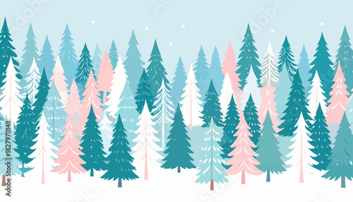 Whimsical winter forest illustration with stylized pine trees in pastel pink, teal, and blue.