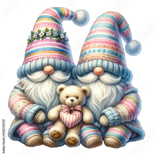 Whimsical Winter Gnomes A charming image featuring two adorable gnomes in pastel-colored striped hats and sweaters, snuggled together with a fluffy teddy bear Perfect for holiday cards, festive