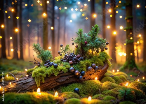 whimsical woodland scene juniper berries dried twinkling fairy lights mossy forest floor magical atmosphere enchanted forest fantasy world
