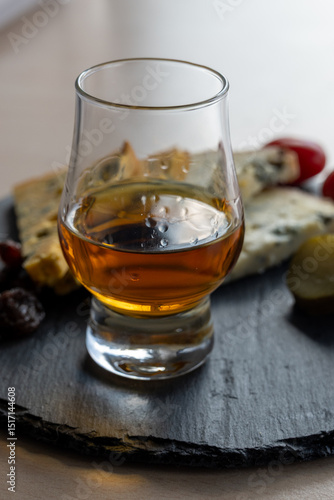 Whiskey and cheese pairing, tasting whisky glass and plate with sliced blue stilton and blue shropshire cheeses, Great Britain food and drink