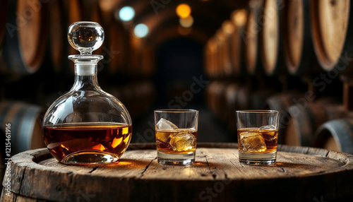 Whiskey decanter and glasses on a barrel with a rustic wooden barrel backdrop.