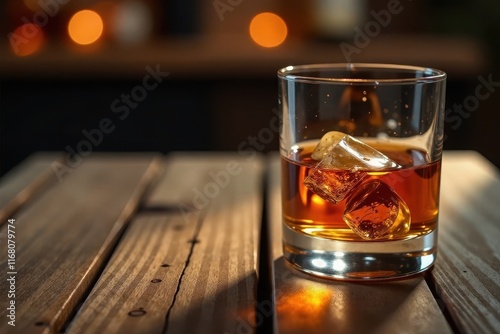 Whiskey glass on a wooden table with amber hues, refreshment, wet surface, wood