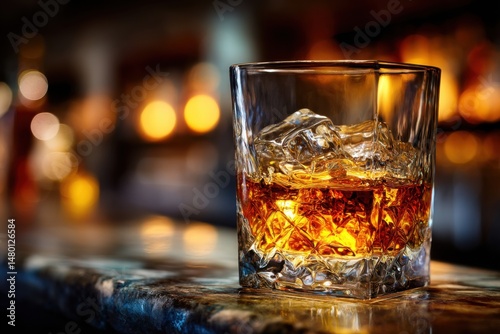 Whiskey in Square Glass with Ice on Countertop, Evening Drink, Beverage Still Life, Alcoholic Drink, Amber Liquid