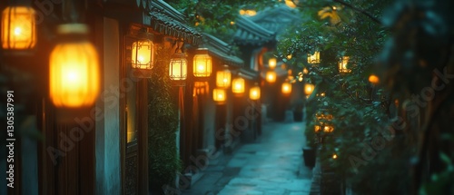 Whispering lanterns gently light a cobblestone street, leading into a peaceful, ancient alley enveloped in tradition and timeless charm.