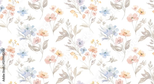 floral, pattern, flower, pastel, watercolor, design, botanical, delicate, soft, subtile, elegant, romantic, summer, nature, blossom, bloom, leaf, background, textile, fabric, wallpaper, print, illustration, repeat, motif, gentle, muted, light, pretty, dainty, wildflower