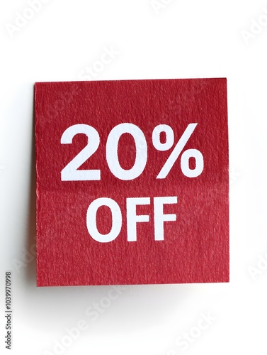 White '20% OFF' Text on a Dark Red Square Paper Note. White Background