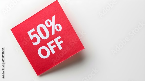White '50% OFF' Text on a Red Square Paper Note. White Background with Copy Space