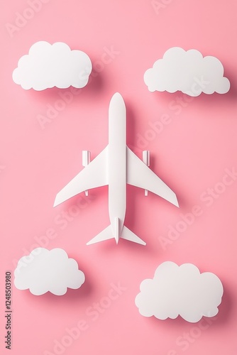 aeroplane, plane, travel, journey, flight, cloud, sky, pink, background, white, model, toy, paper, craft, air, transportation, vacation, holiday, summer, freedom, adventure, exploration, destination, trip, get-away, wing, aircraft, altitude, soaring, overhead, view, minimal, simple, design, concept, abstract, pastel, colours, cute, illustration, image, photo, picture