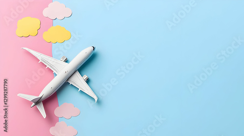 aeroplane, flight, travel, transportation, sky, cloud, blue, pink, white, journey, vacation, holiday, tour tourism, air, destination, adventure, symbol, model, concept, business, commercial, topview, minimal, isolated, copy space, background, overhead, planning, worldwide, dream, fly, transport, earth, plane, abstract, graphic, design, toy, miniature, paper, decoration, creative, modern, arrangement, illustration, shape