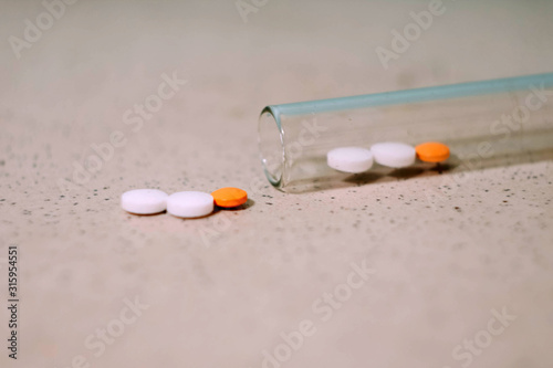 White and orange pill in test tube. Medial experiments. Close up drug manufacturing. Pharmacy business.