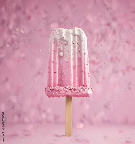 White and pink popsicle with sprinkles on a stick held in the air, isolated, dessert, yummy, tasty, cold
