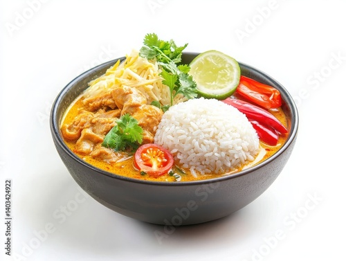 White background showcasing a flavorful Thai curry and rice.