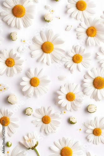 White background with scattered daisies and petals, minimalist aesthetic, white and yellow accents, flat lay