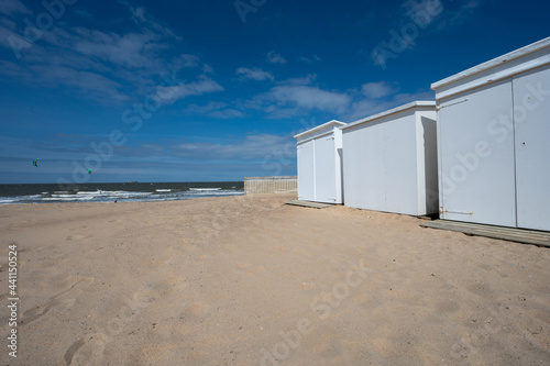 White beach huts on yellow sandy beach in small Belgian town Knokke-Heist, luxury vacation destination, summer holidays