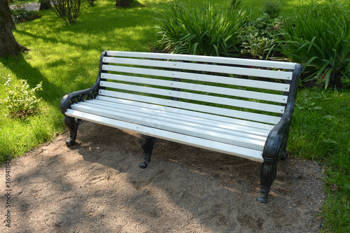relax, white, bench, green, beautiful, garden, landscape, park, plant, summer, curve, furniture, rest, seat, scene, empty, light, space, sun, design, grass, holiday, nobody, background, nature, wooden, shrub, bush, spring, outside, path, leaf, city, floral, peaceful, foliage, lawn, iron, environment, wood, wrought, single, leg, hardwood, plank, striped, comfortable, decorative, metal
