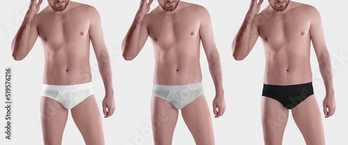 White, black, heather brief mockup on muscular guy, front view, for design, print, pattern.