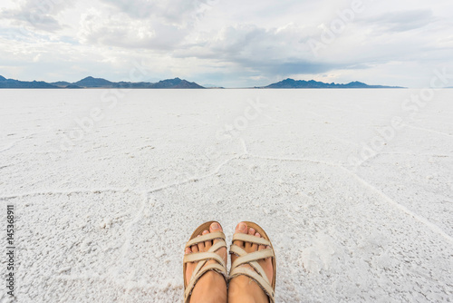 White Bonneville Salt Flats landscape with womans feet and sandals