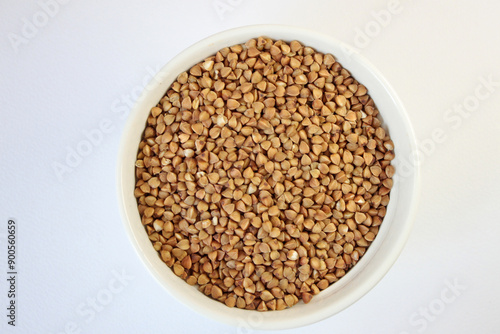 White bowl filled with nutritious buckwheat grains on a clean background, ideal for healthy diets. Perfect for promoting plant-based lifestyles, white background