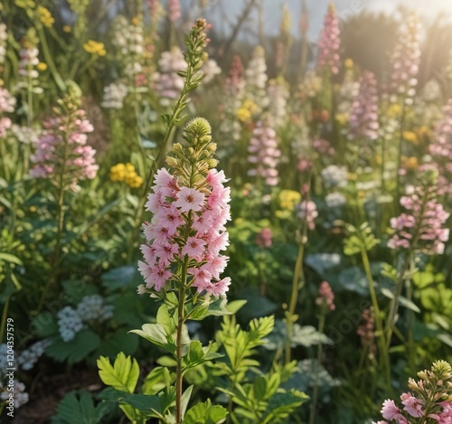 White burnet bush with yellow and pink flowers in the sunlight, natural light, flora, sunny, springtime beauty