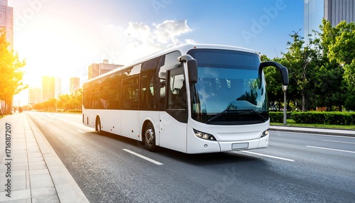 bus, city, street, sunrise, road, urban, travel, transportation, vehicle, white, modern, daylight, city landscape, landscape, morning, sunny, moving, transport, exterior