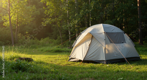 White camping tent set up on grassy clearing at forest edge with warm sunset light. Outdoor shelter for wilderness vacation and summer nature exploration
