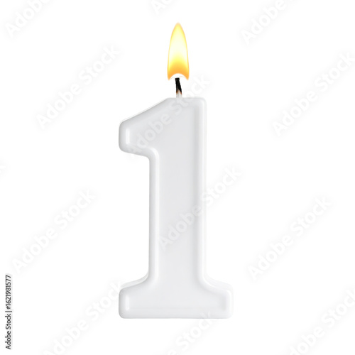 White candle in the shape of the number one with a lit flame isolated on a transparent background.