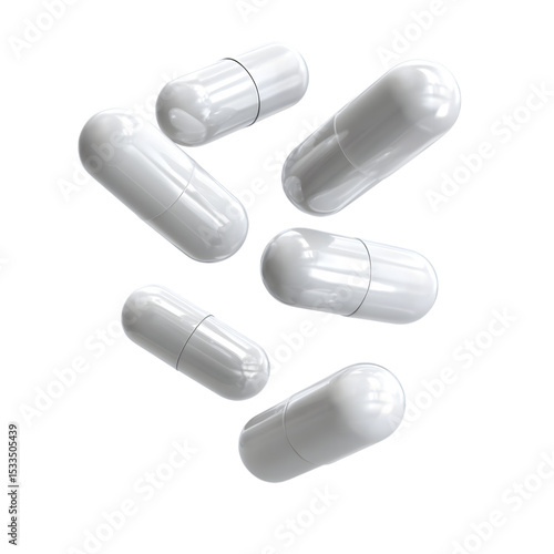 White capsules in a scattered arrangement on a transparent background medical healthcare concept