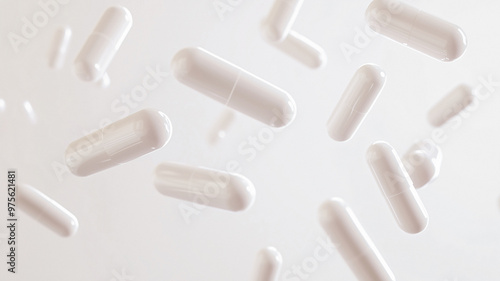 White capsules spread out in the air on black background