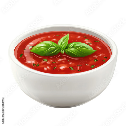 White ceramic bowl filled with rich tomato sauce garnished with fresh basil leaves and herbs isolated on transparent background.