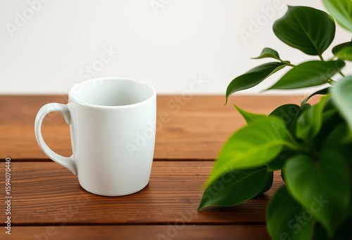 White ceramic mug rests on wooden table beside leafy green plant, white, vibrant