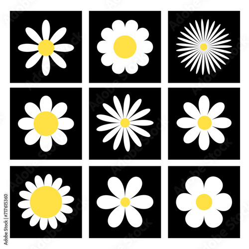 daisy, flower, chamomile, chamomile, set, vector, icon, baby, background, beautiful, big, bloom, blossom, botanical, card, cartoon, white, shape, frame, valentine, black, silhouette, colours, colourful, banner, line, date, square, decoration, design, floral, flowerpot, gardening, growing, growth, head, nubes, illustration, children, leaf, love, nature, plant, retro, season, spring, stem, summer, wheel