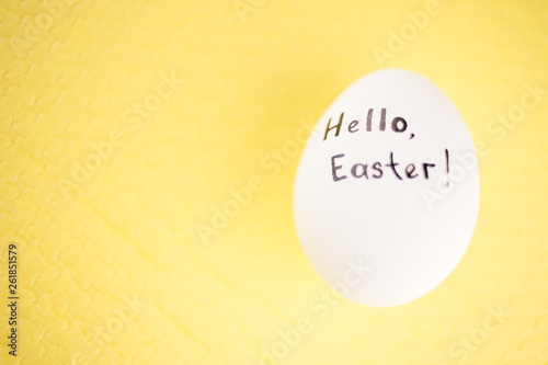 White chicken egg with black inscription hello easter
