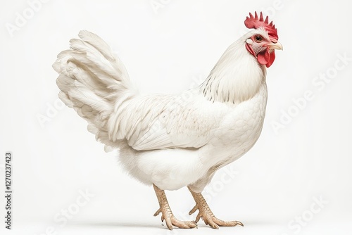 chicken, white, standing, leg, looking, right, red, comb, tail, feather, isolated, background, farm, animal, poultry, bird, colourful, feature, head, wing, body, detail, natural, pose, profile, closeup, clarity, simplicity, elegance, rustic, traditional, farm animal, domestic, nature, living, creature, barnyard, breed, species, feathered, beak, eye, unique, characteristic, portrait, purity, contrast