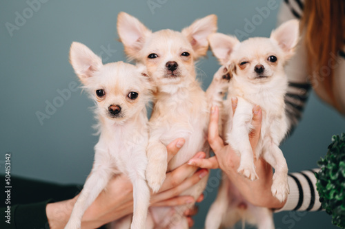 White chihuahua puppies look at the camera and squint which are held in their hands. blue background