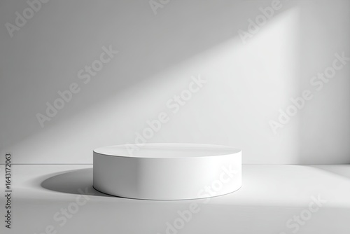 empty, dais, white, circle, cylinder, studio, minimalist, product, display, light, shadow, sunbeam, geometric, modern, clean, blank, presentation, showcase, surface, elevated, round, abstract, photo, design, rendering, three-dimensional, illuminated, bright, space, background, monochromatic, perspective, simple